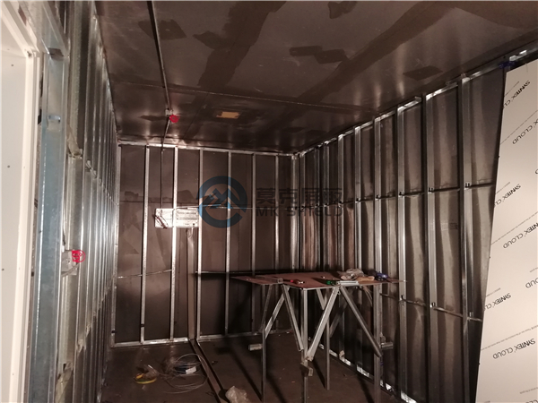 板型屏蔽室,是靠在屏蔽室的板壁上有射頻感應(yīng)電流的產(chǎn)生與流通,通過(guò)接地系統(tǒng)導(dǎo)流達(dá)到屏蔽的目的。所以,采用整塊金屬板屏蔽,其感應(yīng)電流的分布均在屏蔽體的整個(gè)表面,電流所遇到的感抗比集中在金屬網(wǎng)網(wǎng)絲上的電流所遇到的感抗小。因此,板型屏蔽室是一種高效能的屏蔽室,適用于近場(chǎng)防護(hù)和抗干擾、保密通信等方面。